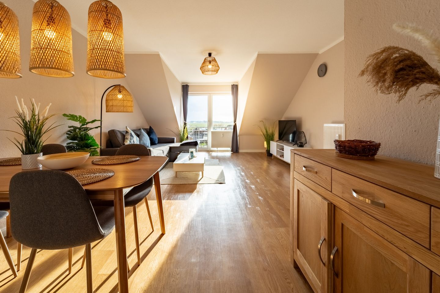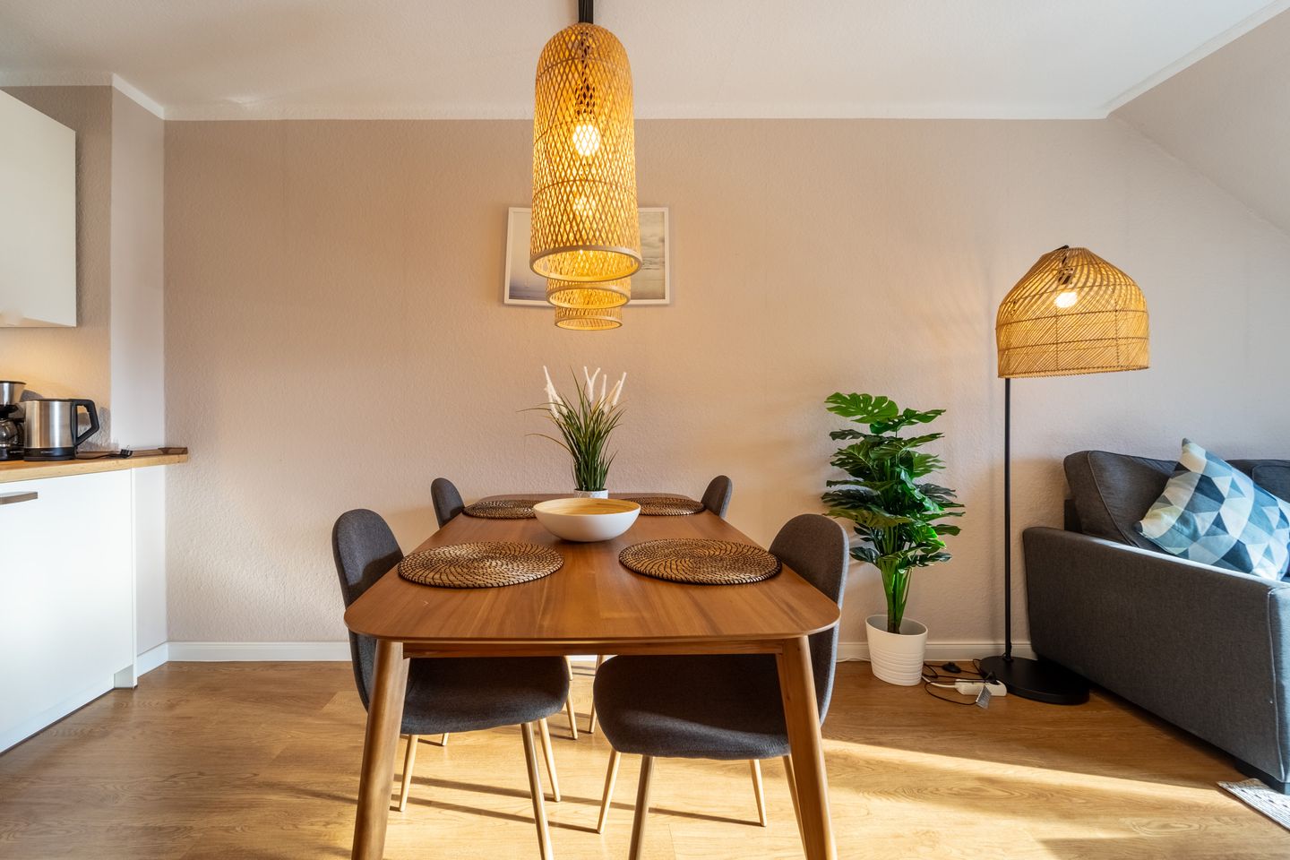 Die Wohnung verfügt über einen offenen Wohn- und Essbereich mit einer modernen, gut ausgestatteten Küche. Hier finden Gäste alles, was sie zum Kochen benötigen – vom Backofen über eine Spülmaschine bis hin zu Kaffeemaschine, Toaster und Wasserkocher. Eine gemütliche Schlafcouch bietet zusätzlichen Platz zum Ausruhen. Das separate Schlafzimmer ist mit einem komfortablen Doppelbett ausgestattet und lädt nach einem langen Tag an der frischen Nordseeluft zu erholsamen Nächten ein.