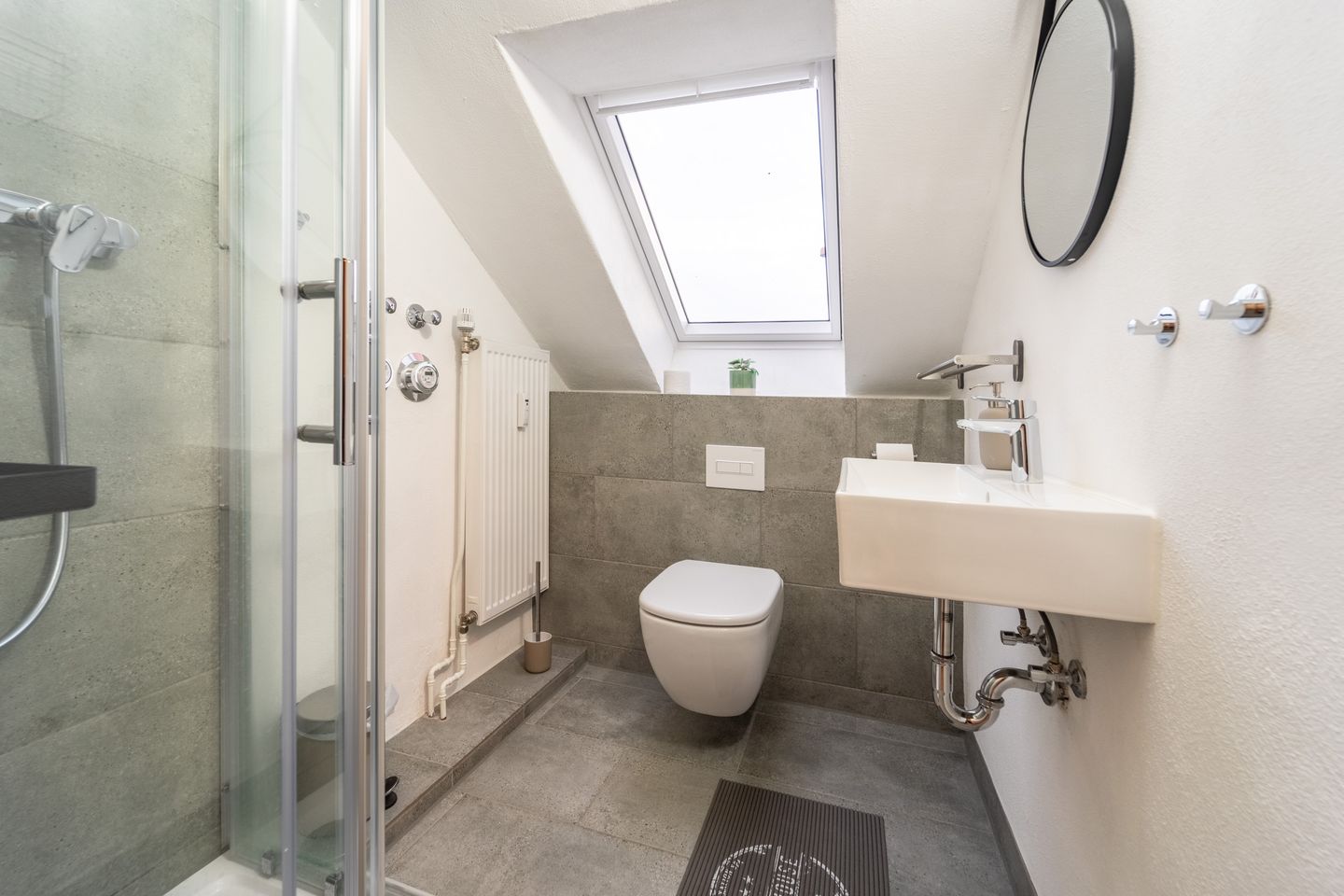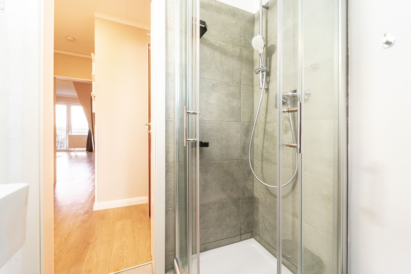 Das *Badezimmer ist funktional gestaltet und verfügt über eine Dusche, die allerdings etwas kompakter ausfällt. Für besonders große oder kräftige Personen könnte dies eine Einschränkung sein.