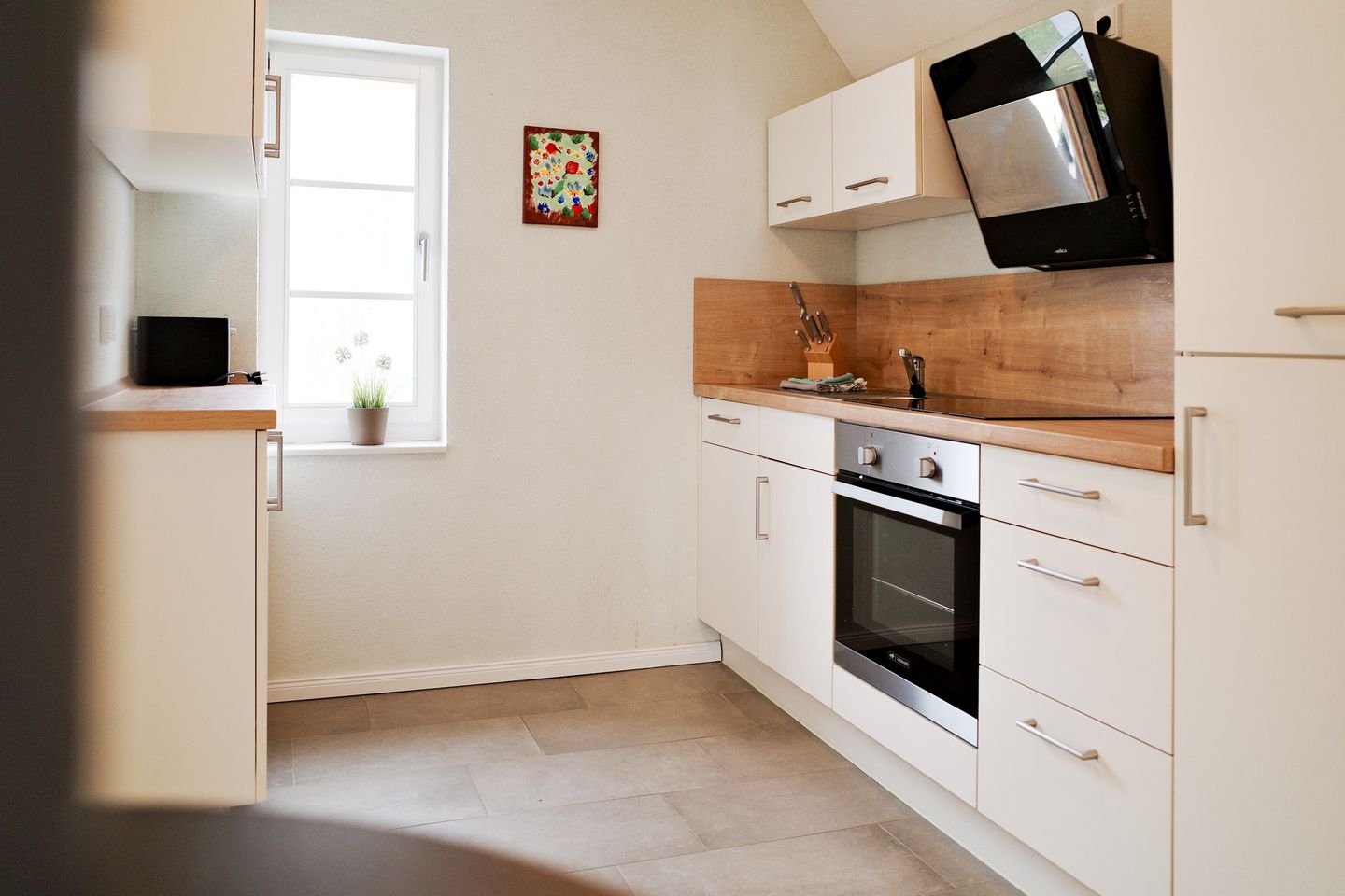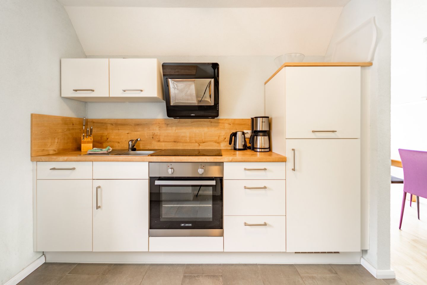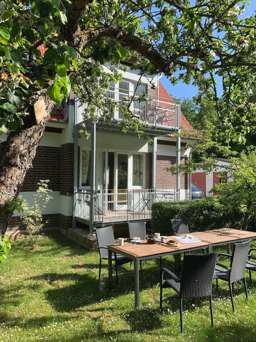 Vom Balkon blickst du direkt ins Grüne – ideal für einen Kaffee am Morgen oder einen Wein am Abend. Das Badezimmer ist hell und funktional mit Dusche und Haartrockner, zusätzlich gibt es ein separates Gäste-WC.